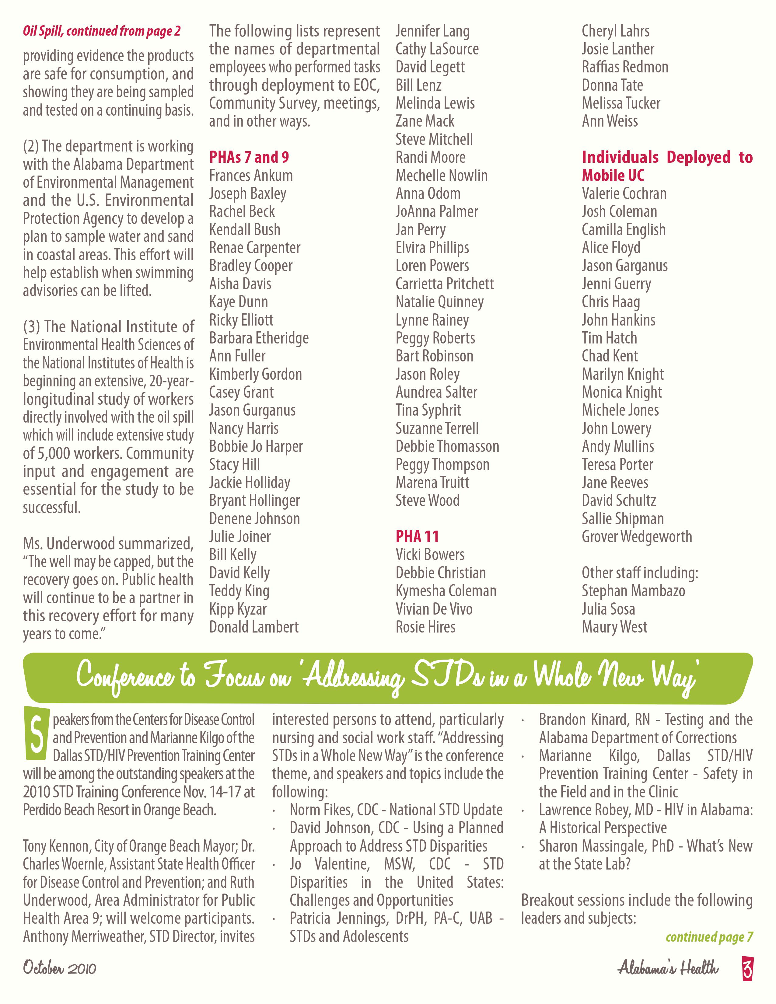Some state publications document how agencies responded to key events in the state. Following the April 2010 Deepwater Horizon oil spill, the Alabama Department of Public Health’s (ADPH) October 2010 newsletter described how the ADPH responded to the crisis. In the first few weeks, ADPH staff worked in Mobile to collect health data and speak with the public and journalists about the health effects of the oil spill. They worked with the Alabama Department of Environmental Management (ADEM) and the Department of Conservation and Natural Resources (ADCNR) to collect data and test samples, and with the Centers for Disease Control and Prevention (CDC) to conduct a survey of physical and mental health among residents in coastal areas. To study the potential long-term effects of the spill and help Alabama recover from the disaster, the ADPH joined two major efforts: (1) they launched a five-year study of fish and seafood products alongside the ADCNR in order to promote the consumption of seafood from the Gulf of Mexico, and (2) they made a plan with ADEM and the U.S. Environmental Protection Agency (EPA) to determine when swimming advisories could be lifted by sampling water and sand. These efforts were chronicled in ensuing ADPH newsletters.