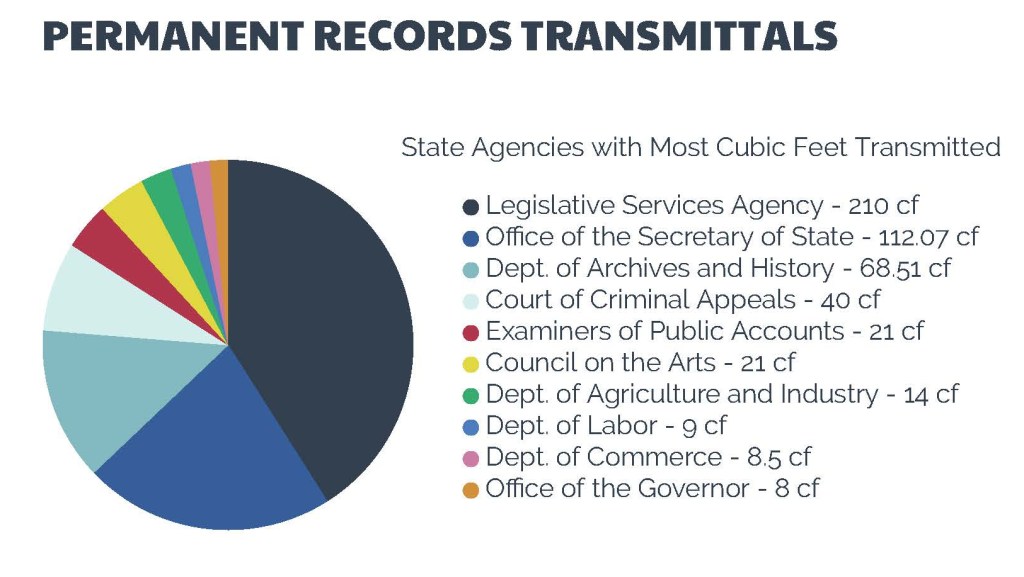 State agencies transferred 527 cubic feet of permanent records in FY 2019 to the ADAH. Some examples of those transmittals include 18 cubic feet of audio recordings, video, and images of field records from the State Council on the Arts; 7 cubic feet of negatives and photographs from Governor Fob James’ administration, and Department of Mental Health patient admission records from Bryce Hospital in Tuscaloosa dating from 1861 to 1952.