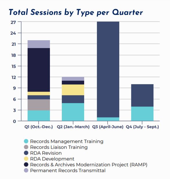 Records Management staff reported on state agency consultations and training sessions. In late March, the section transitioned from mostly in-person consultation to remote consultation via online teleconferencing platforms due to the COVID-19 pandemic. In fiscal year 2020, Records Management staff held a total of 72 outreach sessions with 230 attendees, with 40 of those sessions occurring remotely. Meeting topics included RDA development and revision, records management training, permanent records transmittal, and the Records and Archives Modernization Project (RAMP), a collaboration with the Alabama Office of the Secretary of State.