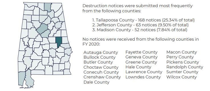 Records Management staff reported on authorized local records destruction. In fiscal year 2020, local governments submitted 663 destruction notices, totaling 53,384.59 cubic feet of obsolete records. The five entities submitting the most notices were (1) Alexander City, (2) the Mobile County Board of Education, (3) the Shelby County Board of Education, (4) the Madison County Board of Education, and (5) the City of Huntsville. Note: Alexander City (in Tallapoosa County) hired a records clerk in FY 2020 who submits destruction notices by the box in accordance with municipal policy, which accounts for the large number of notices from this entity.