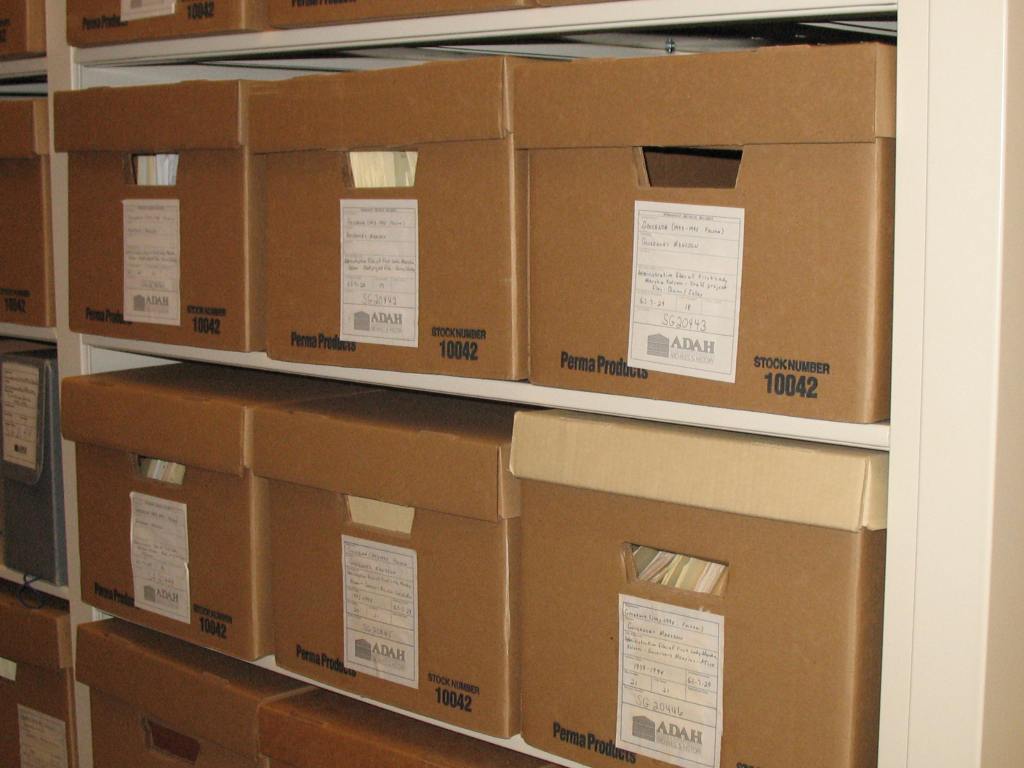 After distinguishing your permanent and temporary records, determine how you will arrange them when returning the boxes to the shelves. Choose a system that works best for your agency or office’s needs and the available records storage space. If you are unable to store boxes of like records near each other that is totally fine! Having intellectual control (knowing what the records are and having the ability to locate the boxes when needed) is far more important than placing like records physically close to one another. This is why having a clear, regularly updated inventory is so important. For example, grant file records could be housed on several different shelves throughout the room but by looking at your inventory, you will be able to quickly locate all of them if needed. If your storage space does allow for a more systematic approach to storing boxes, popular organization methods include storing all records from a division together or storing all permanent records separately from temporary records.