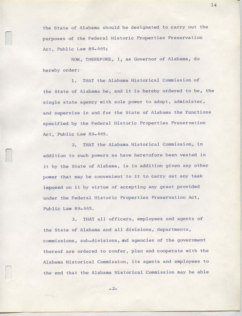 For instance, executive orders can provide information about the expansion of the AHC’s work throughout the years. Governor Lurleen Wallace’s executive order, seen below, grants sole power to the AHC to supervise the functions of the Federal Historic Properties Preservation Act within Alabama.