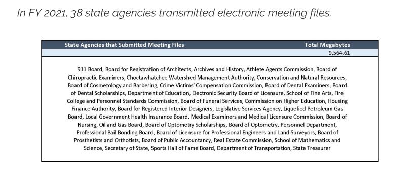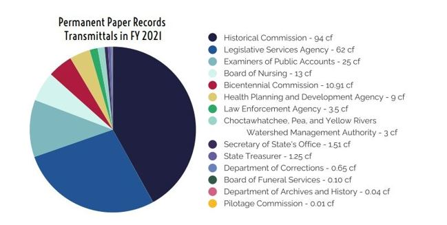 A notable highlight from the report is the transmittal of permanent records from Alabama state agencies to the ADAH. In total, 55 agencies transmitted physical and electronic permanent records during FY 2021. Over 210 cubic feet of physical permanent records and 625,780.59 MB of electronic permanent records were transmitted.