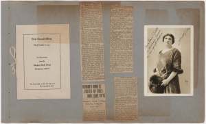 Literacy helped democratize the hobby. Clive Thompson wrote about this phenomenon in his Smithsonian Magazine article “When Copy and Paste Reigned in the Age of Scrapbook,” describing how some men compiled articles on strange deaths, and women pasted news articles and pamphlets on house cleaning methods into scrapbooks. It was also common for clubs and sports teams to sponsor communal scrapbooks filled with photographs, newspaper clippings, and programs from events or games. Political activities were also commonly represented within scrapbooks as is seen below in Adele Kahn Weil’s scrapbook. Kahn Weil was a lifelong Montgomery resident, active in several civic clubs during the late nineteenth and early twentieth centuries.